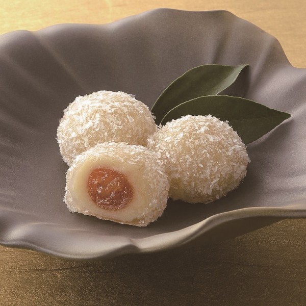 Kumquat covered with white bean pasts and soft rice cake with flaky powder.